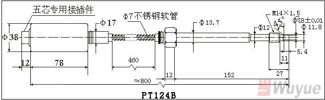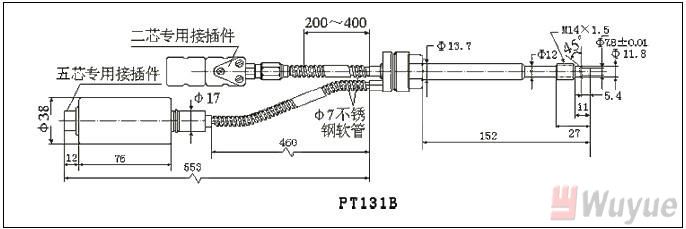 5、選型舉例:PT124B-20MPa-M14-152/460-2/5單功能軟管型變送器20MPa,M14×1.5。直桿長152mm,軟管長460mm,五芯接插件,4-20m A輸出。